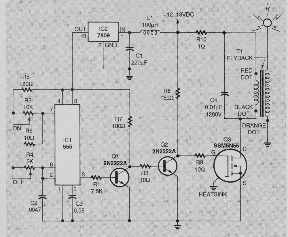 Este circuito se encontró en un Electronics Now de 1994. El circuito usa un antiguo flyback de TV analógico y el MOSFET de potencia admite equivalentes. Se puede utilizar cualquier tipo para 100 V o más con una corriente superior a 5 A. La fuente de alimentación de 12 a 18 V debe suministrar al menos 3 A de corriente. El MOSFET debe montarse en un radiador de calor. El flyback primario consta de 5 a 10 vueltas de cable común en la parte inferior del núcleo de ferrita.