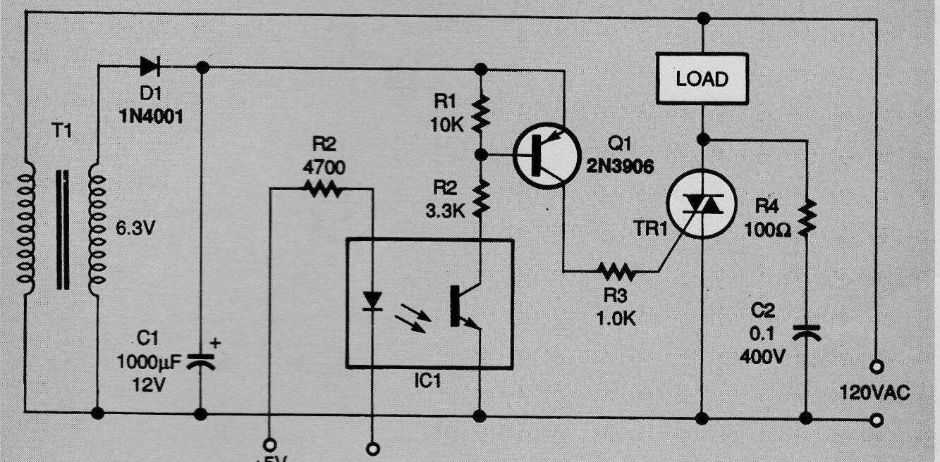Este circuito de relé de estado sólido (SSR) es de una Electronics Now de 1995. Con él podemos conectar cargas de potencia usando señales CMOS o TTL de entrada. Finalmente, R2 debe cambiarse de acuerdo con la señal de activación. TR1 puede ser cualquier Triac de la serie TIC con corriente según la carga y tensión según la alimentación, que también puede ser 220/240 V. El transistor puede ser el BC558 y el transformador 6 V x 100 mA o más. En este circuito tenemos un circuito que deriva la tensión de control de la red eléctrica de modo que sea CC para alimentar el acoplador. El Triac debe estar equipado con un radiador de calor.