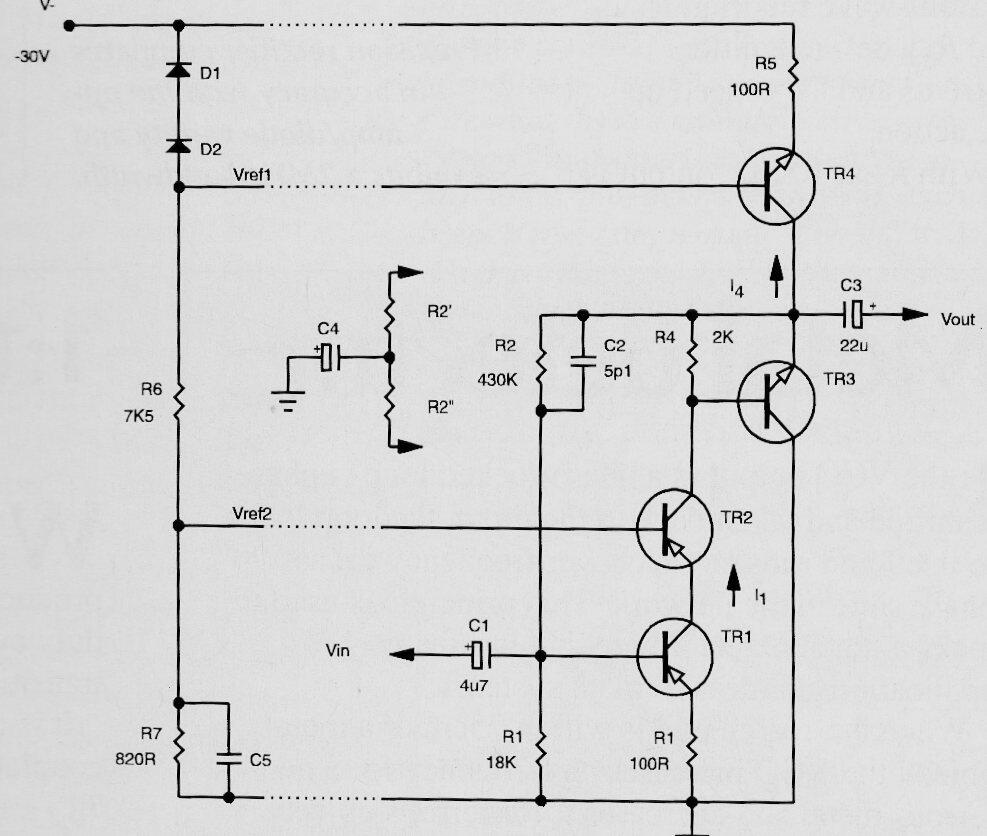 Este amplificador inversor es de una publicación de 1992. Los transistores NPN pueden ser el BC548 y el PNP BC558. Observe la polaridad de la alimentación. C5 puede ser 100nF y C4 puede ser 100uF. Se debe tener cuidado con los cables de alimentación y R2 puede tener valores entre 47k y 100k.
