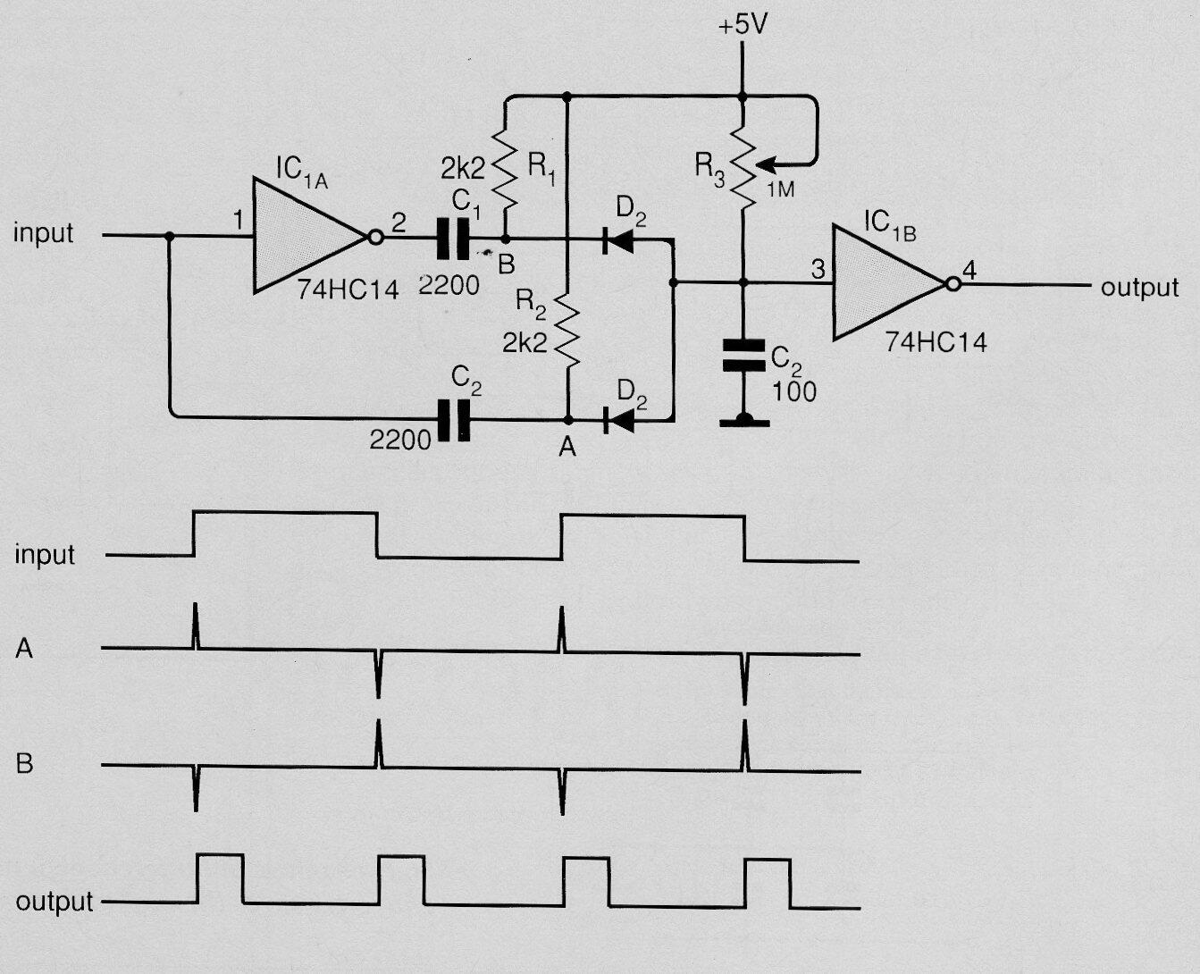 Este circuito, que se encuentra en una documentación de 1991, duplica la frecuencia de una señal TTL. La frecuencia máxima es de unas pocas decenas de megahertz, según la subfamilia TTL utilizada. El ajuste del punto de operación se realiza en R3 y los diodos son de propósito general como el 1N4148. La alimentación debe realizarse con una tensión de 5 V. Las formas de onda del circuito se dan debajo del diagrama.