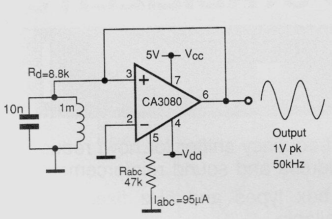 Encontramos este circuito en una documentación de 1994. Muestra cómo generar 50 kHz con un amplificador operacional de transconductancia (OTA). El circuito debe estar alimentado por una fuente simétrica y la red LC determina la frecuencia de la señal generada. Se pueden usar otros amplificadores operacionales de transconductancia y la red resonante se puede cambiar a otras frecuencias.