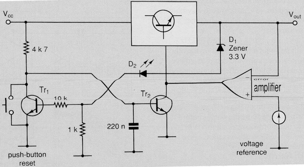 Encontramos este circuito en una documentación técnica de 1994. Conectado a la base del transistor regulador de una fuente, pone a cero su salida cuando ocurre un cortocircuito. Los transistores flip-flop pueden ser BC547 y el amplificador de error puede ser un comparador como el LM339. El circuito se reinicia mediante un interruptor de presión. La tensión de entrada puede variar entre 6 V y 30 V normalmente.