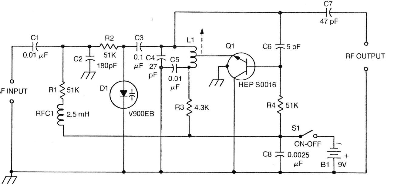 Este circuito puede servir como base para un pequeño transmisor de FM con varicap. Lo encontramos en una publicación de los años 70 y el transistor podría ser el BF494. Se puede utilizar cualquier varicap de la serie BB. La alimentación proviene de una pequeña batería de 9 V. Podemos conectar la antena a la salida RF y usar un micrófono de cerámica en la entrada moduladora. La bobina consta de 2 + 2 vueltas de alambre 28 en forma de 1 cm de diámetro. El alcance será de unas pocas decenas de metros. Los componentes pueden tener sus valores aproximados a los estándar actuales.