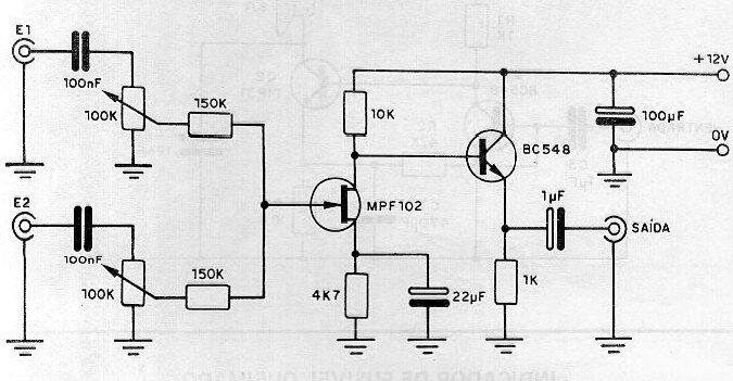 El circuito que se muestra consta de un preamplificador con dos (o más) entradas. La impedancia de entrada es alta y la ganancia excelente, con bajo consumo. La salida es de baja impedancia y se pueden agregar hasta 10 entradas al mismo circuito. Una resistencia de 330 ohms a 570 ohms en serie con la fuente puede ayudar a desacoplar el circuito, reduciendo el ruido, si es alimentado por una fuente. Los cables de entrada y salida deben estar blindados y las conexiones entre los componentes deben ser cortas. Se pueden utilizar FET equivalentes como BF245. Se puede encontrar un circuito similar en la sección de circuitos simulados del sitio web.