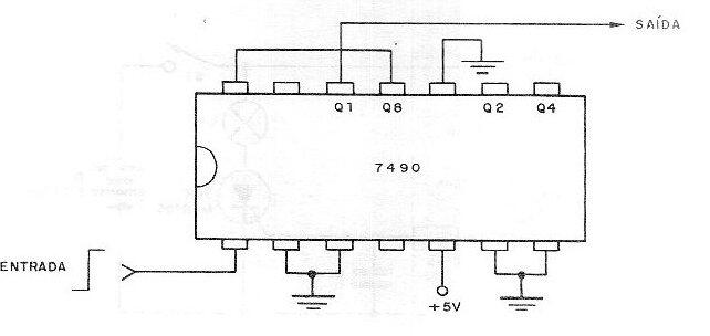 Este circuito divide la frecuencia de una señal TTL entrante por 10. El circuito integrado es el 7490 y varios de ellos se pueden conectar en serie para obtener la división por 100, 1000, etc. La alimentación es de 5 V y la frecuencia máxima es de unas pocas decenas de megahertz. Sin embargo, las subfamilias integradas se pueden utilizar en la misma configuración.
