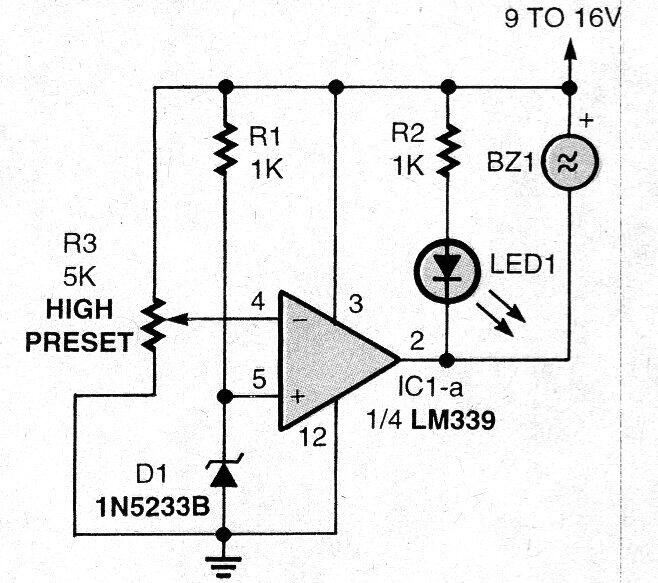 Cuando la tensión en el circuito excede el valor establecido en el trimpot, el LED se apaga y, si se usa un zumbador de baja corriente, suena. El circuito es de documentación estadounidense de 1999.