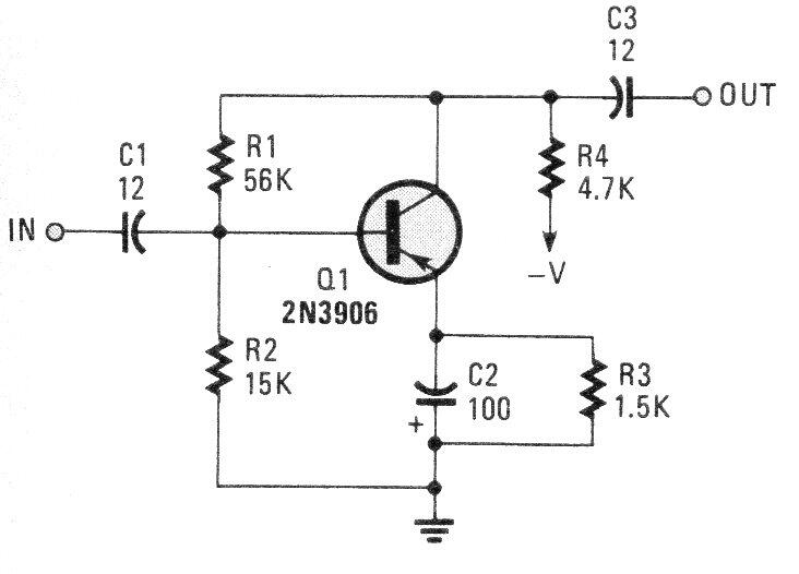 Este es un amplificador para audio de baja intensidad y señales de baja frecuencia. El transistor puede ser un BC558 y la alimentación se realiza con tensiones de 6 a 12 V. Encontramos la configuración en una documentación de los años 80.