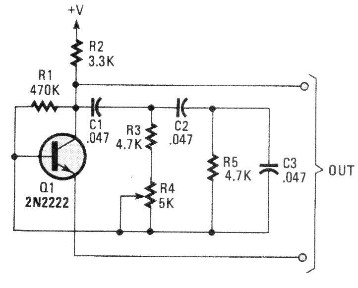 Este tradicional circuito oscilador de desplazamiento de fase se encontró en una documentación de la década de 1980. El suministro se puede realizar con tensiones de 9 a 15 V y la señal generada es sinusoidal. La frecuencia depende de C1, C2 y C3.