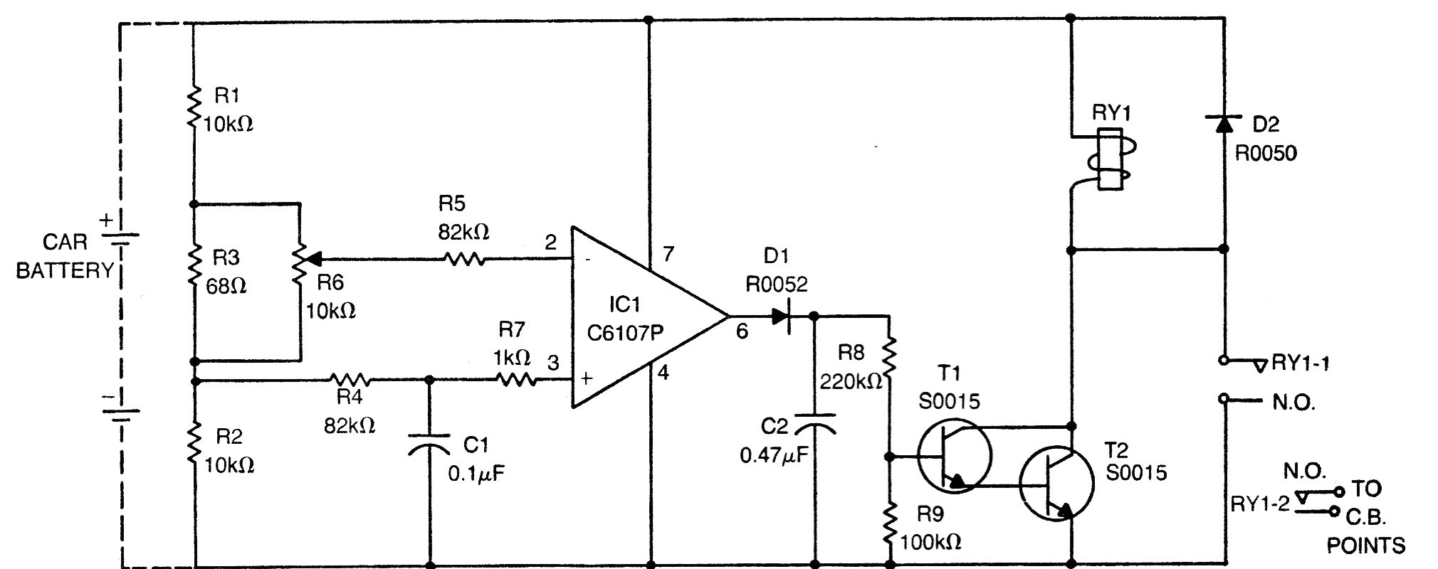 El circuito integrado puede ser cualquier operacional y T1 puede ser un BC548 y T2 un TIP41 en este circuito de una publicación de 1978. Lo que hace es sentir una pequeña variación de tensión dada por el ajuste de R6 accionando un circuito de tiempo que coloca en corto el platinado evitando el funcionamiento del motor. Así que se siente cuando alguien entra en el coche o cuando intenta dar la partida, inmovilizando unos instantes después el coche. El circuito es para coches de 12 V y el relé para la misma tensión.