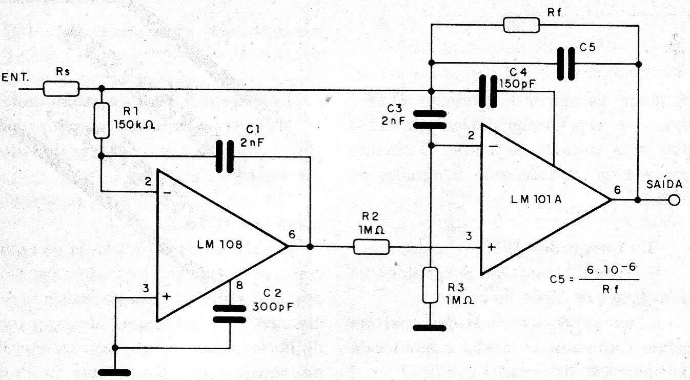 Este circuito fue sugerido por National Semiconductor en uno de sus manuales. El circuito integrado LM108, poco común en la actualidad, puede ser reemplazado por un equivalente. La fuente de alimentación debe ser simétrica.