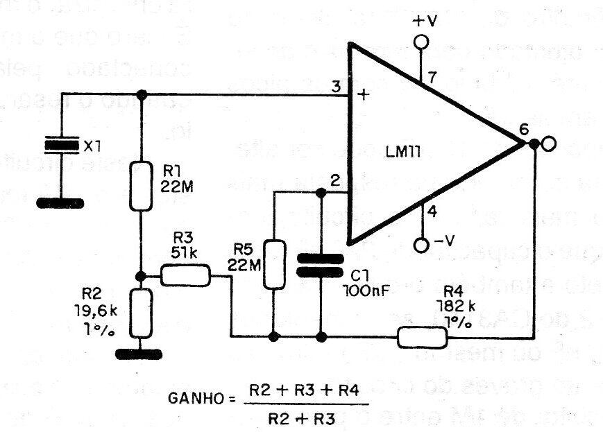 Este amplificador, propuesto por National Semiconductor, se caracteriza por su impedancia de entrada muy alta de 880 megaohms y hace uso de un LM11. La fuente de alimentación debe ser simétrica de 9 a 15 voltios y los resistores en los puntos más críticos deben estar dentro del 1% de tolerancia. Una de las aplicaciones de este circuito es en sensores de vibración, o incluso en audio.