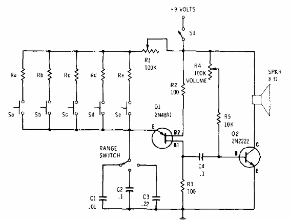 Encontramos este simple instrumento musical en una documentación de Radio Shack de 1977. Los resistores de las teclas deben ser obtenidos experimentalmente en el rango de 1 k a 1 M para conseguir la afinación deseada. Para alimentación de 12 V. Q2 puede ser un BD135.