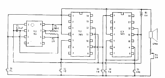 Encontramos este circuito en una documentación de Radio Shack de 1977. El circuito debe ser alimentado con 5 V, pues se trata de TTL. Recomendamos conectar un diodo en serie con B1 si se utiliza el 6 V original.