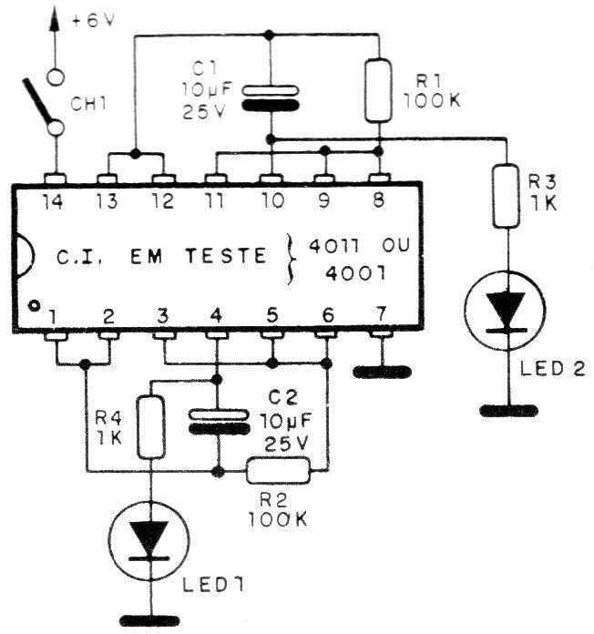 Este sencillo circuito permite probar los circuitos integrados CMOS 4001 y 4011. Consta de un oscilador que debe hacer parpadear dos leds, si están en orden. El circuito puede alimentarse con tensiones de 5 a 12 V y su consumo es bajo.