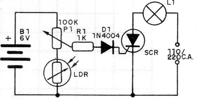 Este circuito simple enciende una pequeña lámpara (o LED) cuando la luz deja de brillar sobre el sensor por un instante. El ajuste de sensibilidad se realiza en el potenciómetro o potenciómetro y el circuito se bloquea. Considere la caída de tensión en el SCR si alimenta el circuito con 6 V.
