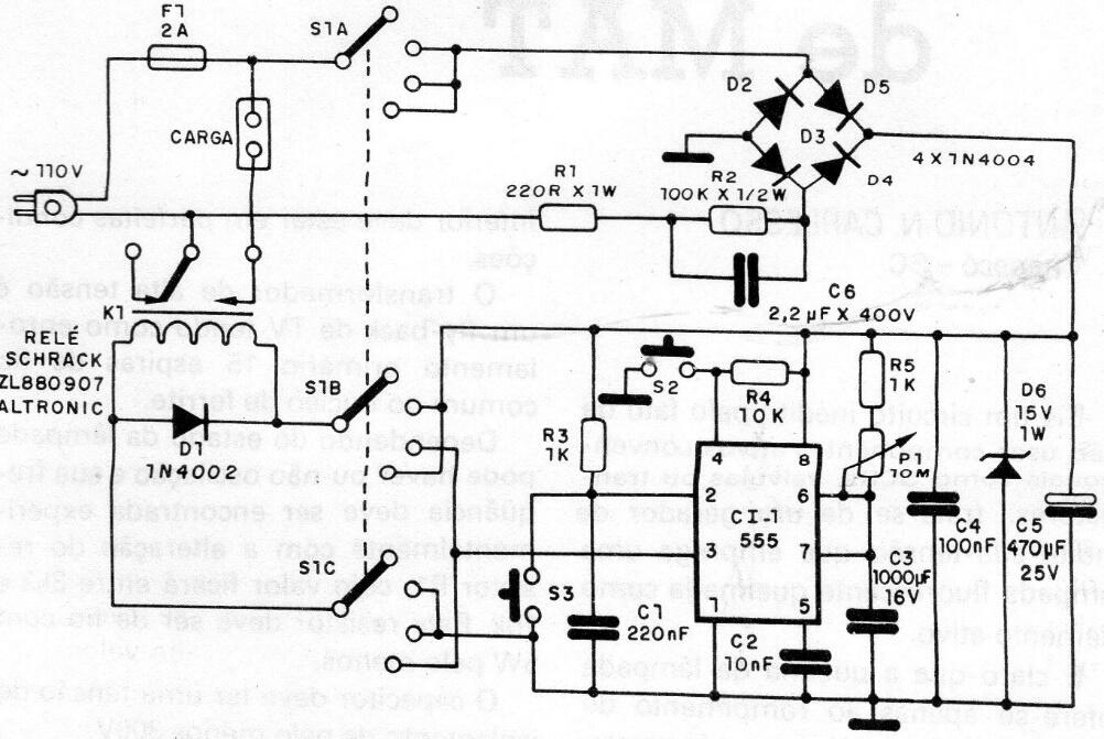 Este temporizador utiliza componentes absolutamente comunes en la actualidad. Activa un relé después de intervalos que se pueden ajustar hasta cerca de 1 hora con los componentes indicados. El circuito tiene el ajuste de tiempo en P1 y S2 es un reinicio que descarga el capacitor de tiempo. El relé es sensible a 12 V. El circuito incluye una fuente sin transformador.