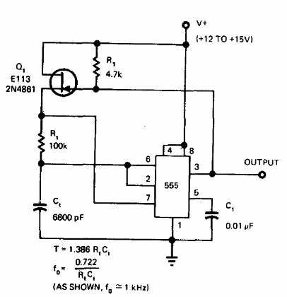 Con esta configuración, obtenida en una documentación de 1977, es posible obtener señales cuadradas (con 50% de ciclo activo) usando un 555. La frecuencia es calculada por las fórmulas junto al diagrama y el FET puede ser un BF245 o equivalente.