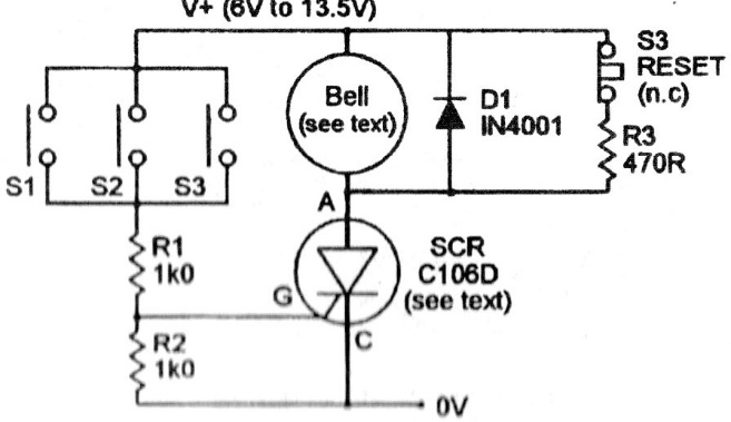 Este circuito utiliza sensores NA encontrados en una publicación americana de los años 90. La alimentación debe hacerse con 2 V más que el voltaje del sistema de alerta, para compensar la caída de tensión en el SCR durante la conducción.
