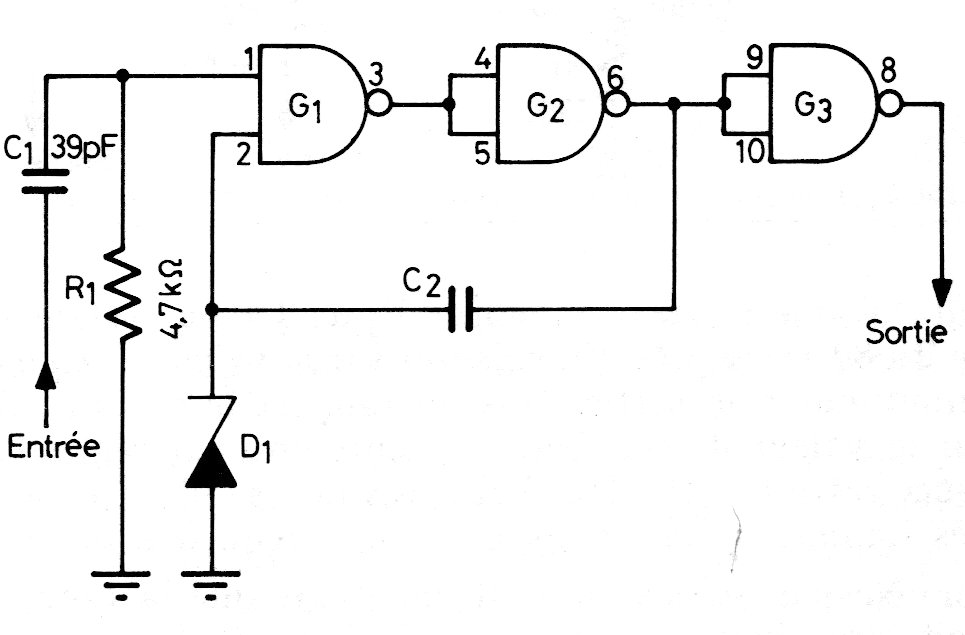 Este circuito de disparo TTL con el 7400 se puede utilizar como acondicionador de señal en un shield de entrada para microcontroladores. El circuito es antiguo, pero la aplicación es moderna. El suministro debe hacerse con 5 V. Encontramos el circuito en una documentación europea antigua. El diodo zener puede ser de 3 a 3,7 V.