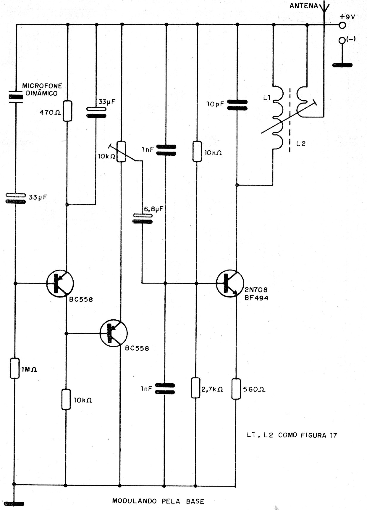 Encontramos este circuito en un libro espía de los años 90. Los transistores admiten equivalentes y la bobina se puede diseñar como en el proyecto anterior. La alimentación es proporcionada por baterías o batería de 9 V.