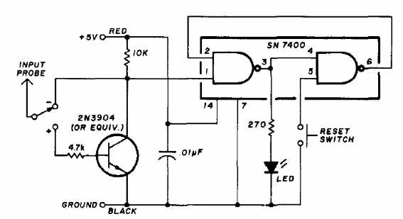 Este circuito es de una documentación de 1977. Es alimentado por la propia tensión del circuito en prueba. El circuito indica los niveles lógicos de los puntos probados. La alimentación debe realizarse con 5 V.