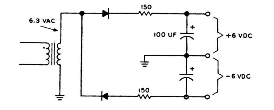 Esta fuente de alimentación simple y no regulada con una tensión de salida aproximado de 6 V puede suministrar corrientes de hasta aproximadamente 500 mA dependiendo del transformador utilizado. Los diodos pueden ser 1N4002.