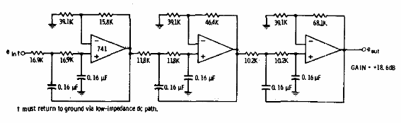 Este circuito originalmente fue diseñado para aplicaciones médicas y experimentos biológicos. El circuito es de una publicación de filtros de 1975. La alimentación debe ser simétrica y los amplificadores operacionales deben ser los 741. El rechazo de frecuencias por encima de 15 Hz es de 30 dB.