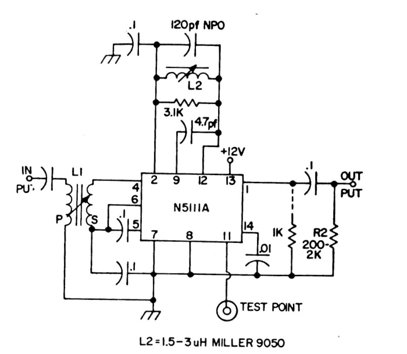 Este circuito se basa en un componente inusual en la actualidad. Demodula una señal FI de 10,7 MHz y se encontró en la documentación de la década de 1980.
