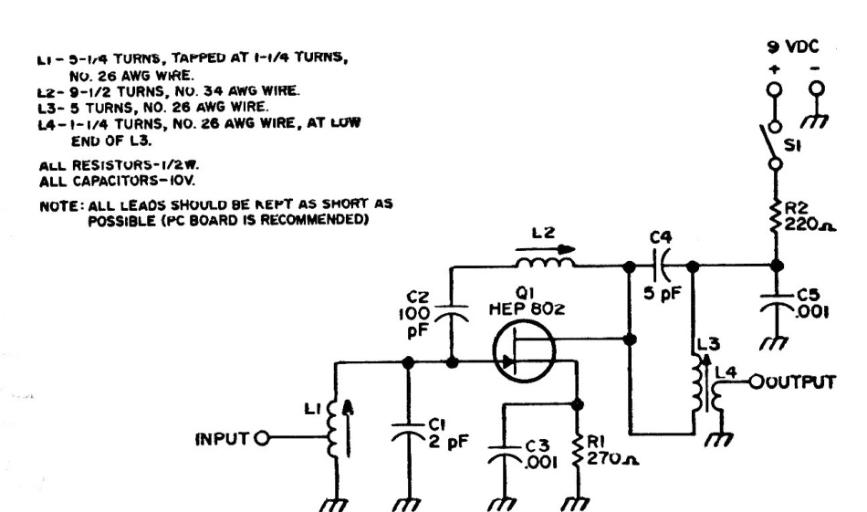 Este amplificador para señales en el rango de 2 m que corresponde a 150 MHz fue encontrado en una documentación americana de la década de 1980.