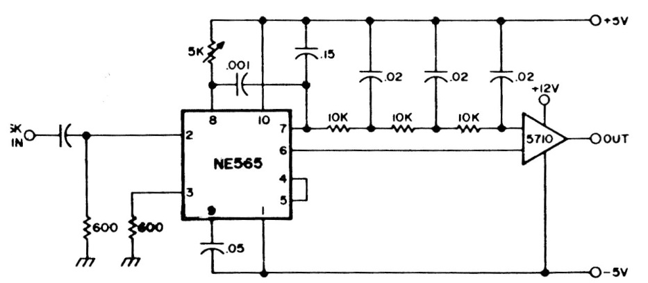 La frecuencia máxima de este circuito es de 500 kHz. Lo encontramos en una documentación para radioaficionados de los años 80. El circuito integrado utilizado es poco común en la actualidad.