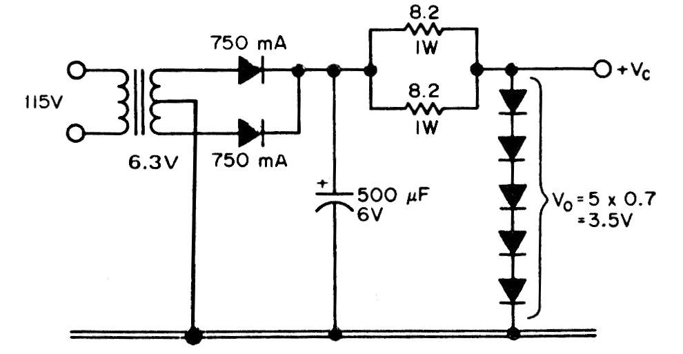 En este circuito tenemos la forma de utilizar diodos comunes para obtener voltajes regulados bajos en una sola fuente. Los diodos deben tener corrientes máximas según la aplicación y las resistencias tienen disipación según la tensión de salida.