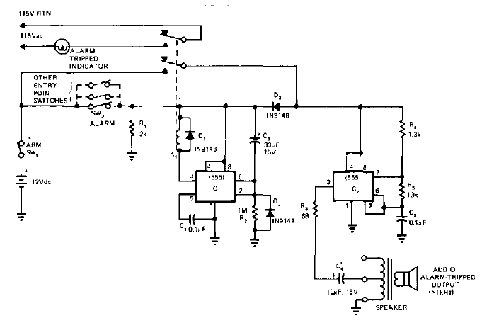 Este circuito se obtuvo en un EDN de los 80. Hace uso de dos 555 y acciona directamente un pequeño altavoz a través de un transformador y un relé.