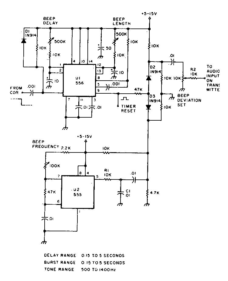 Este circuito se encontró en la documentación para radioaficionados de los años 80. Este es el llamado roger-beep, que es el beep que se transmite cuando se cambia la función hablar-escuchar.