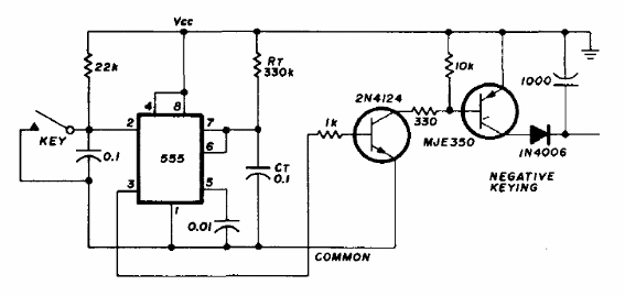 Este circuito fue encontrado en una publicación de telecomunicaciones de 1978. Su finalidad es obtener señales para telegrafía sin repique usando un manipulador común. El transistor NPN puede ser el BC548 y el PNP el BD136. La alimentación se realiza con una tensión de 15 V.