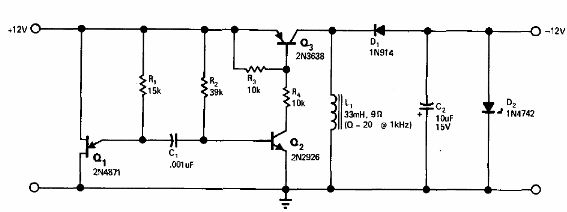 Este circuito convierte una tensión positiva negativa, con corriente de salida máxima del orden de 40 mA. Q3 puede ser un BD136, Q1 un BC548 y el transistor unijuntura puede ser un 2N2646. El circuito es de una documentación de 1971.
