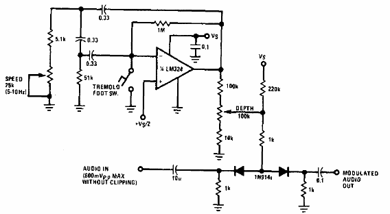 Encontramos este circuito en el Audio Handbook de National Semiconductor de 1977. El circuito produce el efecto de trémulo con instrumentos musicales. La alimentación debe realizarse con tensiones de 6 a 12 V y los cables de entrada y salida de señales deben ser blindados.