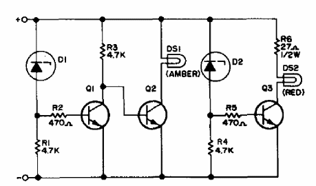 Este circuito monitorea la tensión de una batería de 12 V. Los niveles indicados permiten saber si la batería está cargada o no. El circuito de una publicación de 1973 utiliza lámparas indicadoras, pero se puede cambiar para utilizar los LED. Los transistores pueden ser los BC548.