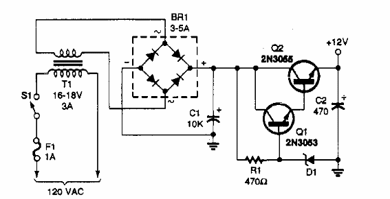Esta sencilla fuente de alimentación de 12 V con corriente de hasta 2 A se encontró en una Popular Electronics de los años 90. El diodo Zener es de 14 V y el transistor Q2 puede ser un TIP42.