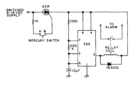 La finalidad del circuito mostrado en la figura es abrir y cerrar los contactos de un relé de forma intermitente accionando bocinas, sirenas, osciladores, etc. El circuito es de una publicación de 1976. Relés de más de 100 mA deben ser accionados con una etapa transistorizada auxiliar. La tensión de alimentación debe ser de acuerdo con el relé usado.
