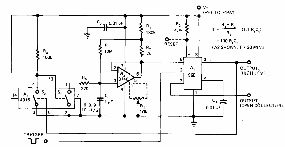 La constante de tiempo de este circuito es 100 x R1 x C1, lo que lleva a la posibilidad de obtener tiempos de muchas horas. El circuito es de una publicación de 1977 y la alimentación depende de la aplicación.