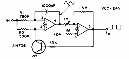 Encontramos este circuito en una publicación para radioaficionados de 1976. El amplificador operacional es de transconductancia como el LM3900 y la alimentación debe ser hecha con fuente simétrica. El transistor puede ser el 2N2222. Con los componentes indicados el circuito produce 400 Hz con 5 V de entrada.