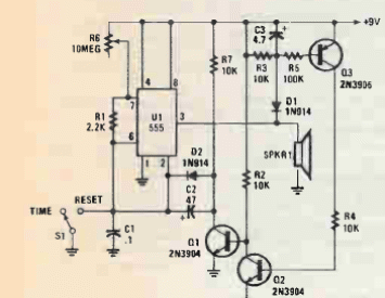 Encontramos este circuito en una Popular Electronics de 1992. El tiempo viene dado por C1. El circuito proporciona un pitido de salida. Los transistores soportan equivalentes.