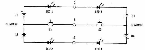 Este simple circuito, obtenido de una documentación de Radio Shack, (1980) prueba transistores y diodos. El circuito es alimentado por dos baterías de 3 V (2 pilas) y los LED son comunes. Es conveniente conectar resistores de 100 ohms en serie con los LED.