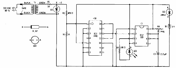 Este circuito fue encontrado en una documentación de Radio Shack de 1977. Su propósito es generar señales de 1 Hz a partir de la red de energía. El 7490 divide la frecuencia de la red para obtener 3 Hz sincronizando el 555 que hace que el LED parpadee a intervalos precisos de 1 segundo. El circuito es para la red de 60 Hz.