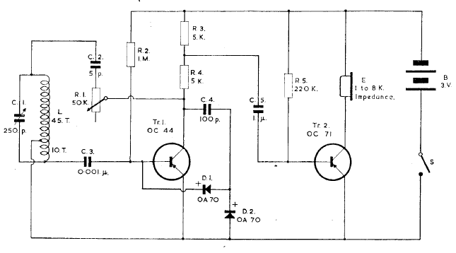 Este receptor reflex para el rango de onda media emplea transistores de germanio de la época. Lo encontramos en una documentación en inglés de 1967.