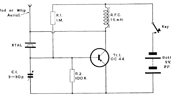 Este transmisor de corto alcance tiene la frecuencia determinada por el cristal. La frecuencia puede estar entre 500 kHz y 2 MHz y el rango es pequeño. El transistor es de germanio.