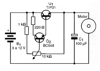 En el circuito de la figura utilizamos un potenciómetro de 1 k ohms. Podemos usar un potenciómetro mayor aún, con corriente menor de control, usando el control de la figura que emplea dos transistores en la configuración Darlington. En este circuito la corriente del transistor Q1 es controlada por el transistor Q2 que, a su vez, es controlada por el potenciómetro de 10 k ohms. De esta forma la corriente en el motor y por lo tanto su velocidad puede ser ajustada con precisión por el potenciómetro. Una ventaja del uso de un componente de baja corriente es que podemos usar cables largos y finos para encenderlo. Esto significa que el potenciómetro de control puede quedar muy lejos del aparato controlado, instalado en una pequeña caja o panel, por ejemplo.
