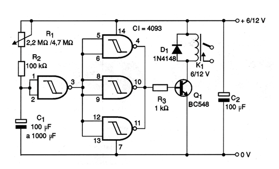 Cuando conectamos la alimentación del circuito mostrado en la figura el capacitor se encuentra descargado y con ello el pino 2 de la puerta conectada como inversora está prácticamente en el nivel lógico bajo. Esto significa que su salida está en el nivel alto. Esta salida está conectada a las otras tres puertas que funcionan como un buffer-inversor excitando el transistor. Con la entrada de estas tres puertas en el nivel alto, su salida permanece en el nivel bajo y con ello el transistor en el corte. El relé estará abierto en estas condiciones. Cuando la carga del capacitor alcanza el punto en que el puerto en el que está conectado reconoce como nivel alto, ocurre la conmutación y con ello la salida de los tres puertos utilizados como buffer va también al nivel alto, excitando el relé que cierra los contactos. La temporización es dada por el tiempo que el capacitor tarda para cargar de cero hasta aproximadamente 1/3 de la tensión de alimentación. Con un potenciómetro de 2,2 M ohms y un capacitor de 2 200 uF se pueden obtener temporizaciones de más de 1 hora.
