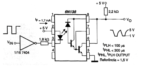 En la figura tenemos la configuración del circuito como un Darlington convencional. En esta configuración no hay necesidad de circuito de polarización. La velocidad de transferencia de datos es de 2 kB / s y la tensión de la señal de salida oscila entre 1 y 5 V.