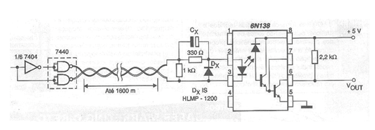 En la figura tenemos un circuito para receptor de línea (par trenzado) con posibilidad de interconectar estaciones hasta 5000 pies (aproximadamente 1 600 metros). La salida es compatible con la lógica TTL estándar y la velocidad de transmisión puede llegar a los 40 kB / s. El circuito tiene un rechazo en modo común y un aislamiento de 2 500 V para la frecuencia de la red de energía de 60 Hz.